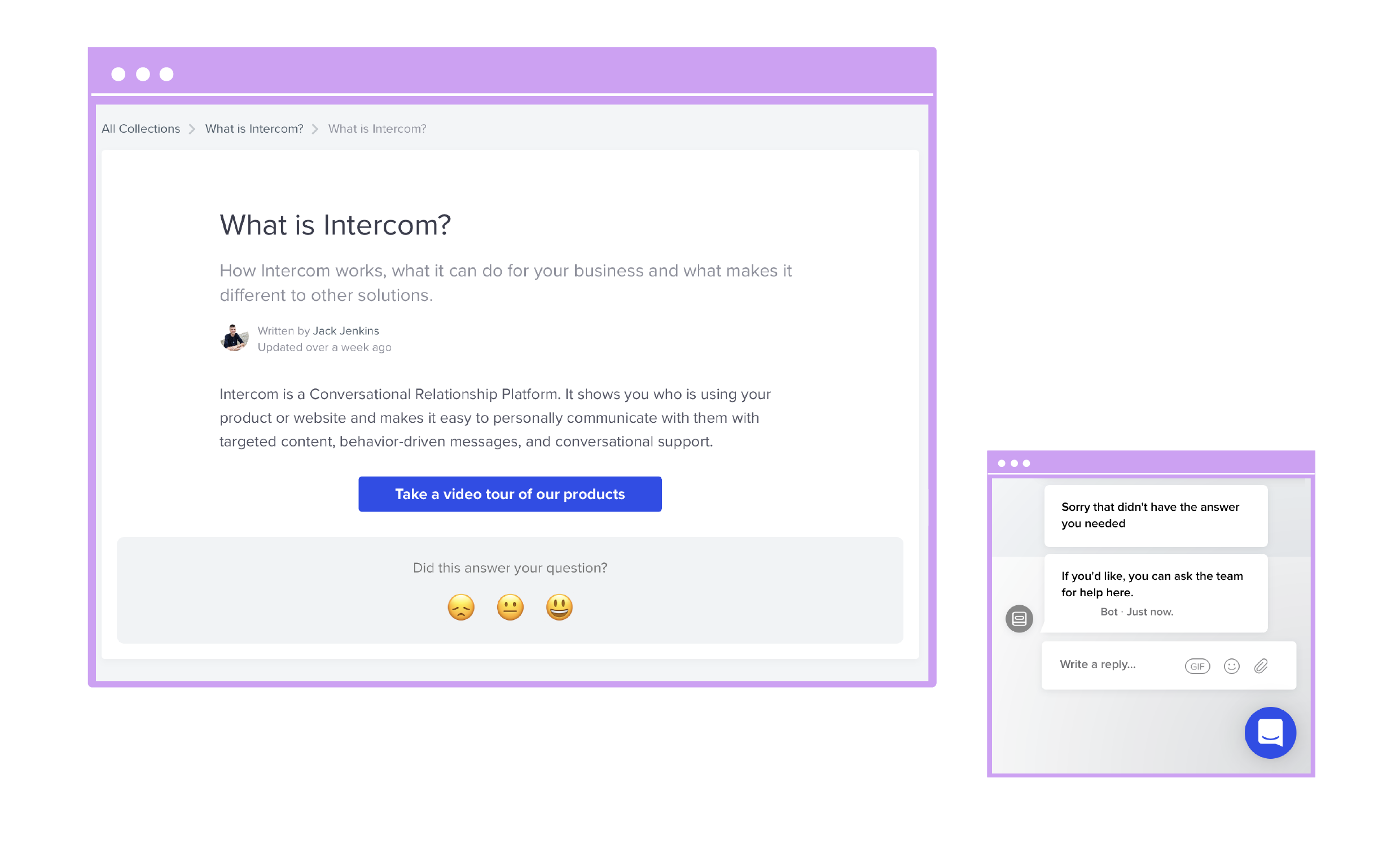 Articles will have emojis at the bottom for readers to rate the article, and if they give a bad rating, an auto message in the Intercom Messenger will pop up saying "sorry that didn't help, let us know here what you're having trouble with and someone will help you resolve it."