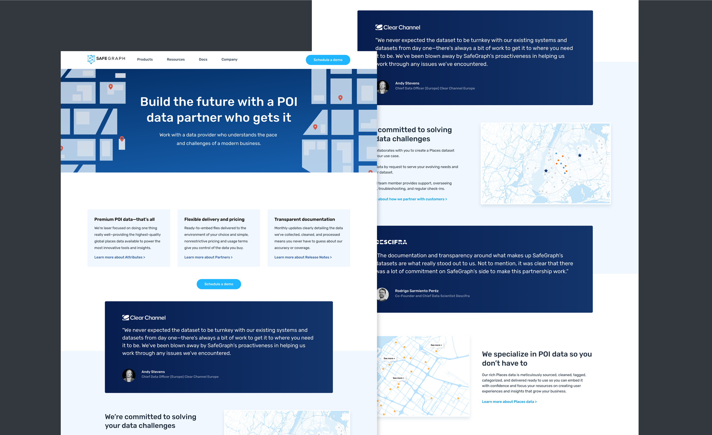Created new pages to highlight SafeGraph’s key differentiators—service and quality, data attributes, flexible pricing—and refined copy across the site with new messaging.